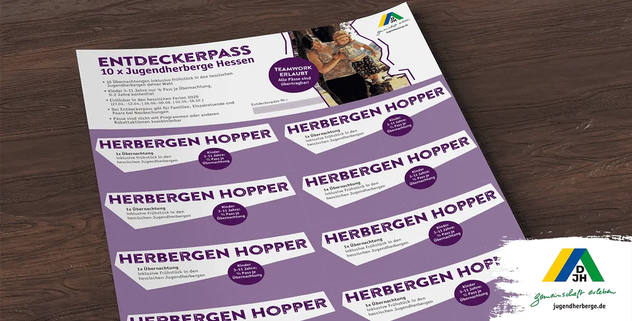 Mit der Neuauflage des Entdeckerpasses gibt es bei den hessischen Jugendherbergen wieder ein Schnäppchenangebot für Familien. Der „Entdeckerpass - Ferienedition 2026“ umfasst 10 Coupons, die für mindestens 10 Übernachtungen inklusive Frühstück genutzt werden können.Gäste ab 12 Jahren benötigen für d